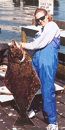 my wife Elaine with her 68# on the next day. She slays the Halibut